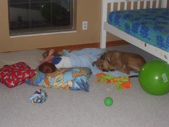 Rolo's adoptive mom says that Rolo and her son start out in the bed at night, but somehow make it to the floor....Cute. (June 2010)